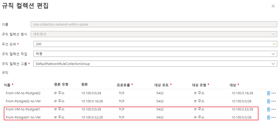 다음으로 Azure Firewall에 가상 머신 ↔ Azure Database for PostgreSQL Flexible Server (VNet Integration) 간 통신에 필요한 Network 규칙을 추가해 줍니다.