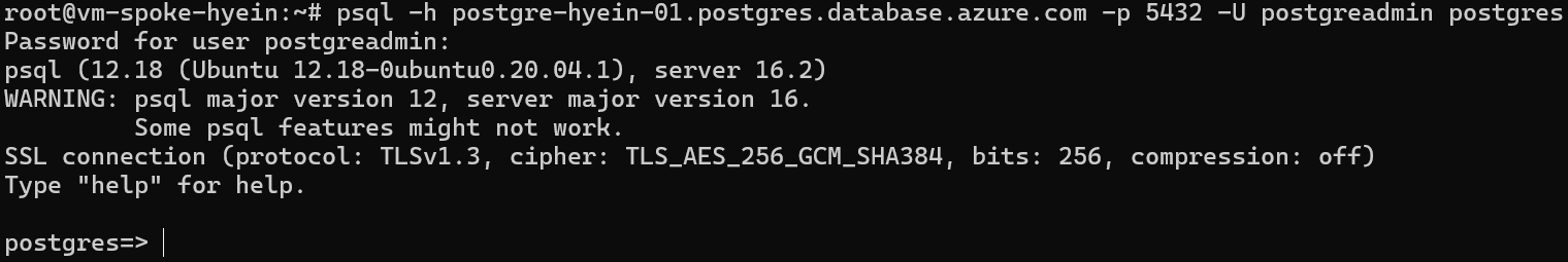 먼저, Spoke 가상 머신에서 Azure Firewall을 거쳐, Private Endpoint와 연결된 Azure Database for PostgreSQL Flexible Server에 접근하도록 테스트 해보겠습니다.
