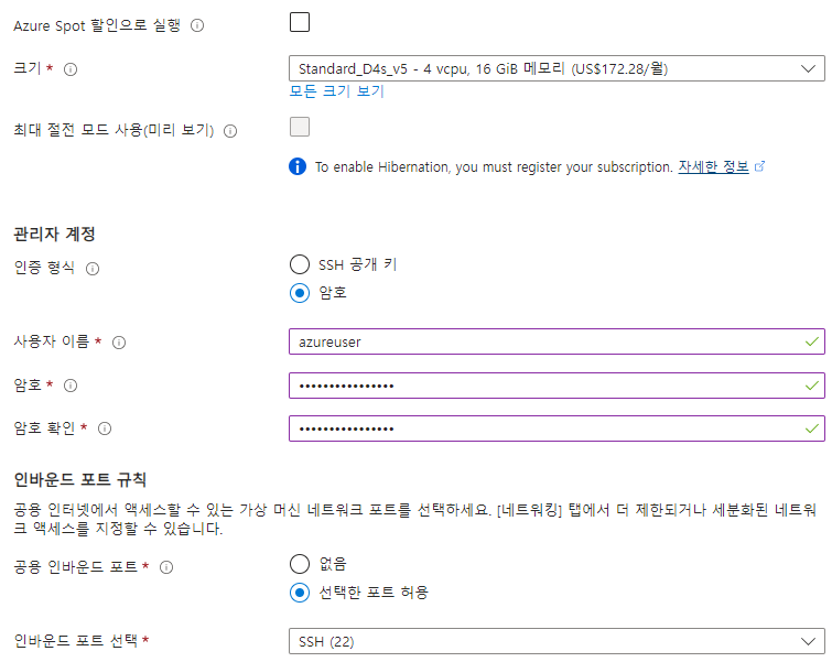 크기 : Standard_D4s_v5 - 4 vcpu, 16 GiB 메모리