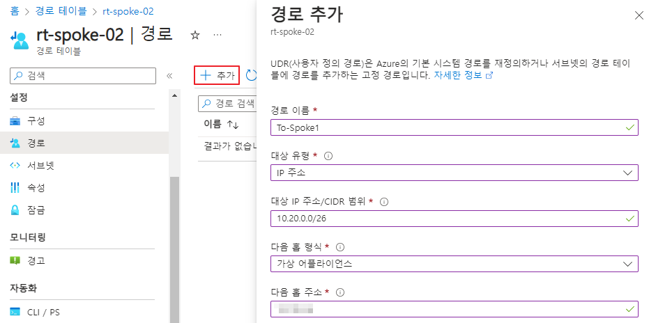 - rt-spoke-01 > [설정] > [경로] > [+ 추가]