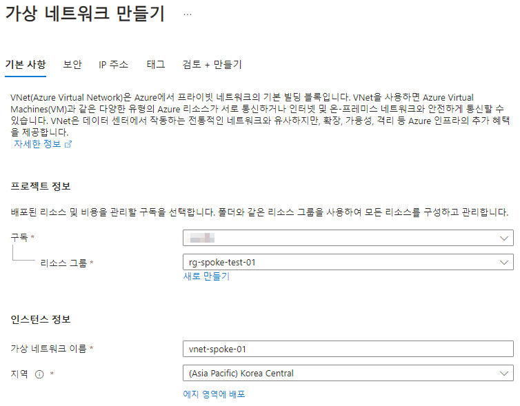 가상 네트워크 이름 : vnet-hub-test # hub용 가상 네트워크 이름 입력
