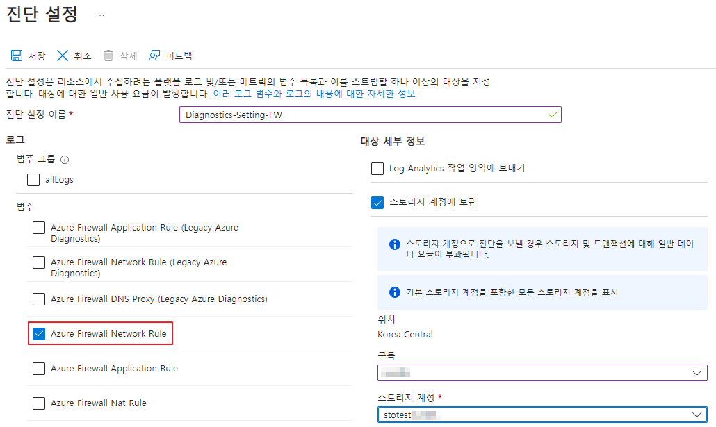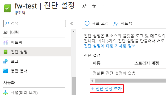 - [방화벽] > [모니터링] > [진단 설정] > [+ 진단 설정 추가]
