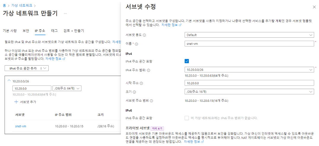 서브넷 : snet-vm 추가 # [+ 서브넷 추가] 버튼을 클릭하여 주소 범위와 크기 입력