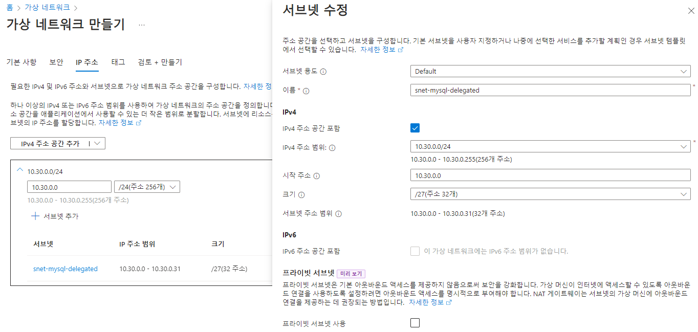 서브넷 : snet-mysql-delegated 추가 # [+ 서브넷 추가] 버튼을 클릭하여 주소 범위와 크기 입력