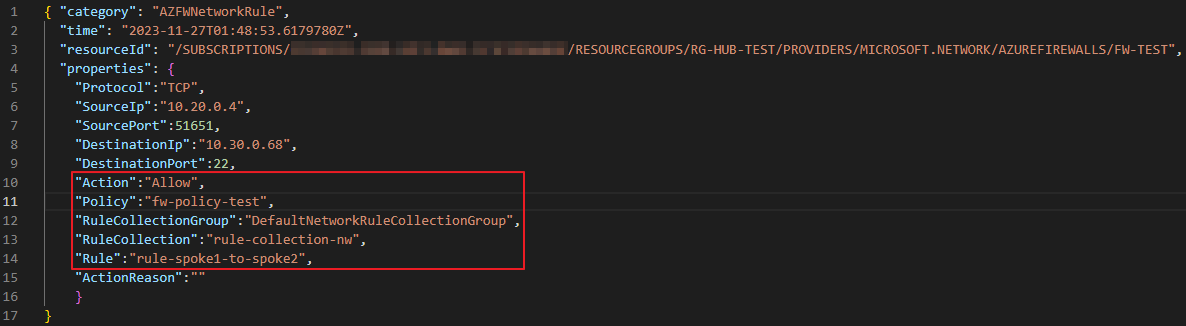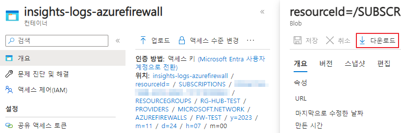 경로 : resourceId=/SUBSCRIPTIONS/{구독 id}/RESOURCEGROUPS/{Resource Group 명}/PROVIDERS/MICROSOFT.NETWORK/AZUREFIREWALLS/{Firewall 명}/년/월/일/시/분/PT1H.json