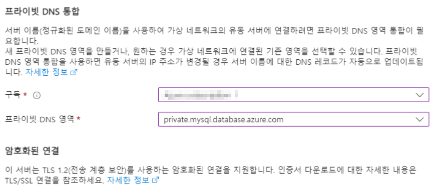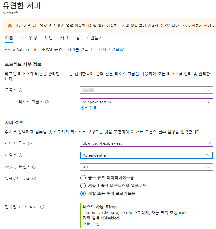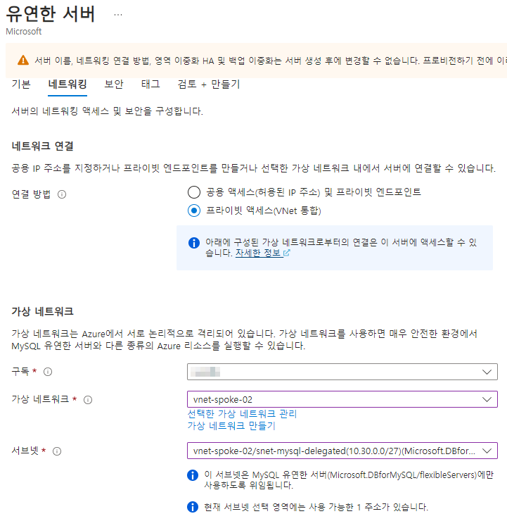 - Azure Database for MySQL - Flexible Server 전용으로 위임된 서브넷이 필요합니다.
