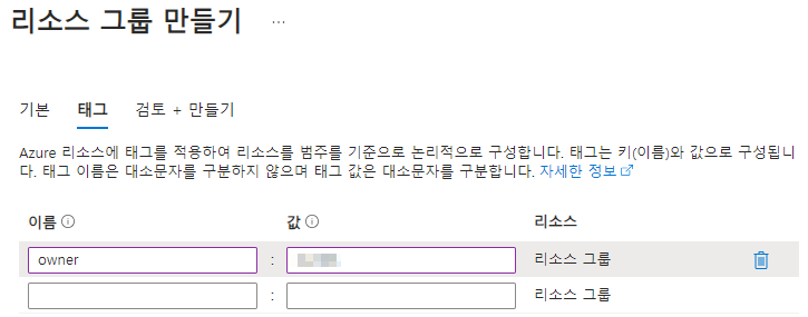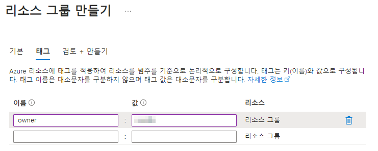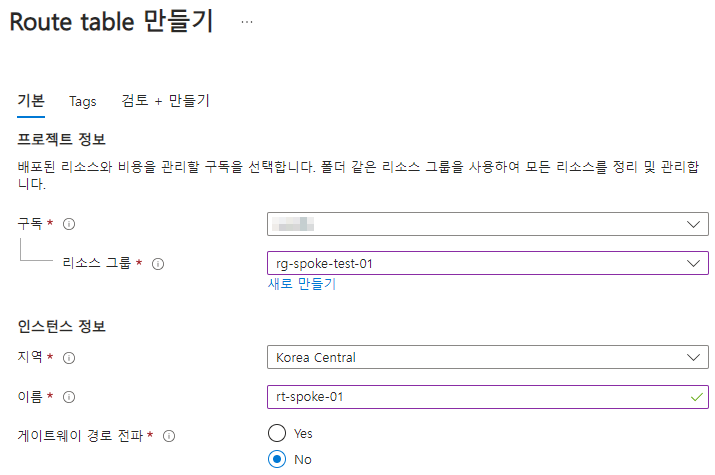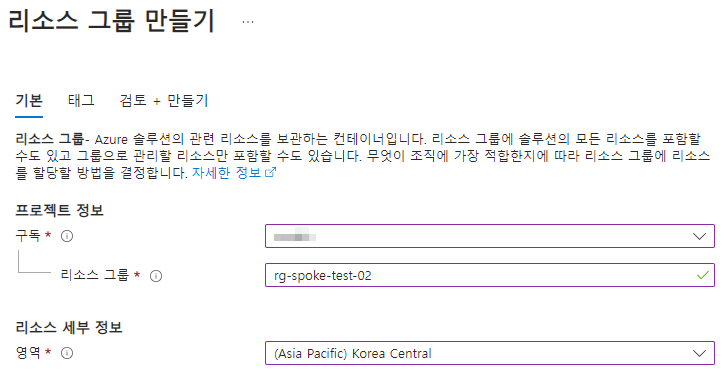 리소스 그룹 : rg-spoke-test-01 # 원하는 리소스 그룹 이름 입력