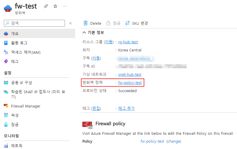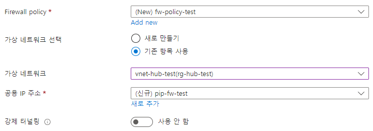 가상 네트워크 : vnet-hub-test # AzureFirewallSubnet이 있는 Hub 네트워크 선택