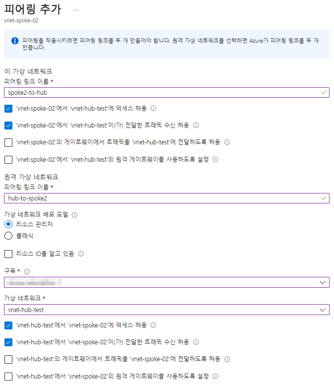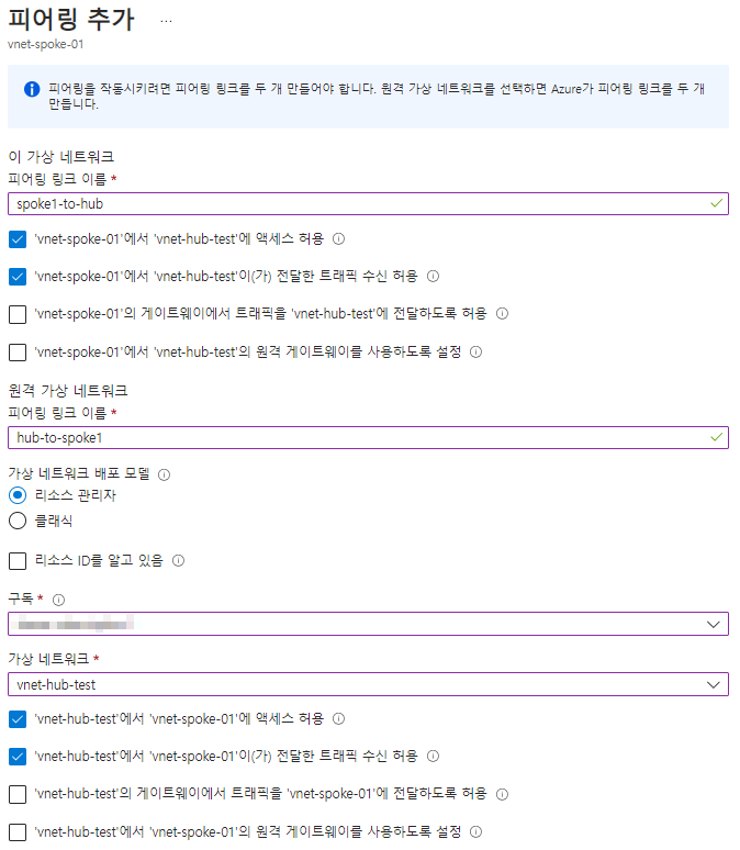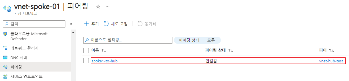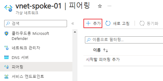 - vnet-spoke-01 > [설정] > [피어링] > [+ 추가]