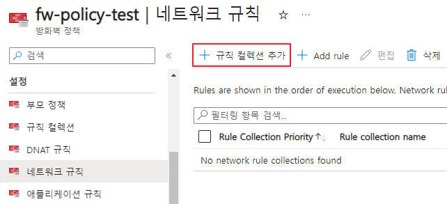 - [설정] > [네트워크 규칙] > [+ 규칙 컬렉션 추가]