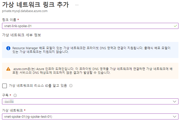 링크 이름 : vnet-link-spoke-01 # 원하는 가상 네트워크 링크 이름 입력