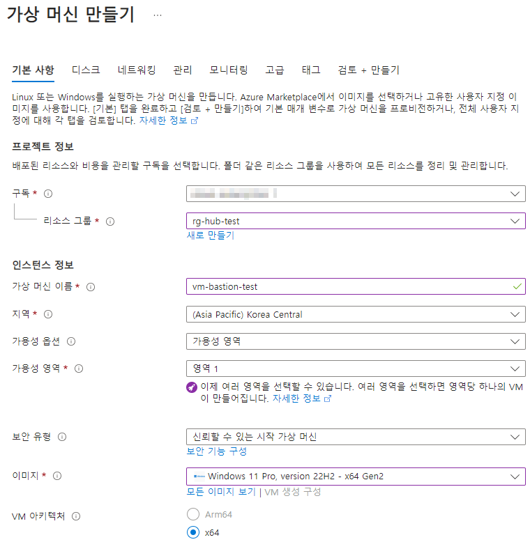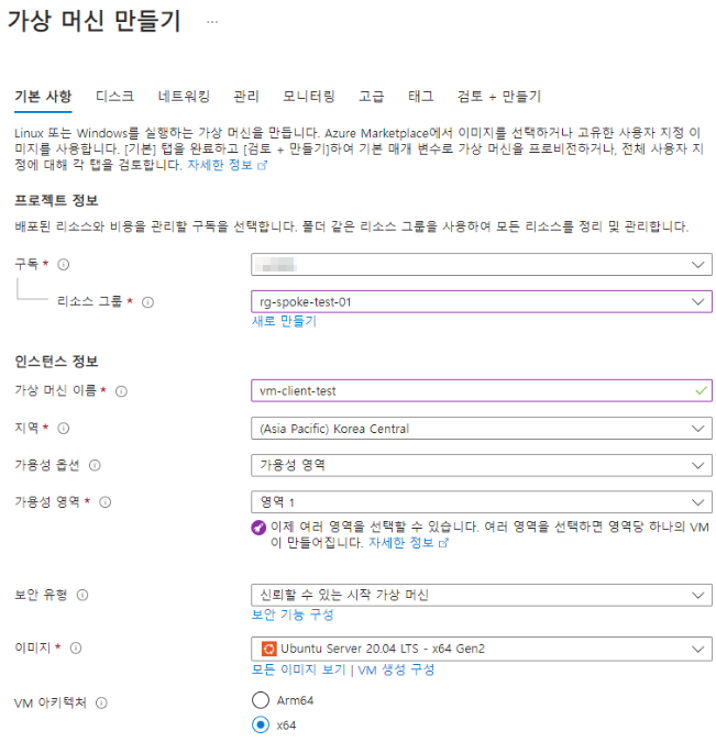 리소스 그룹 : rg-spoke-test-01 # Client용 가상 머신이 있는 Spoke 1 대역의 리소스 그룹 선택