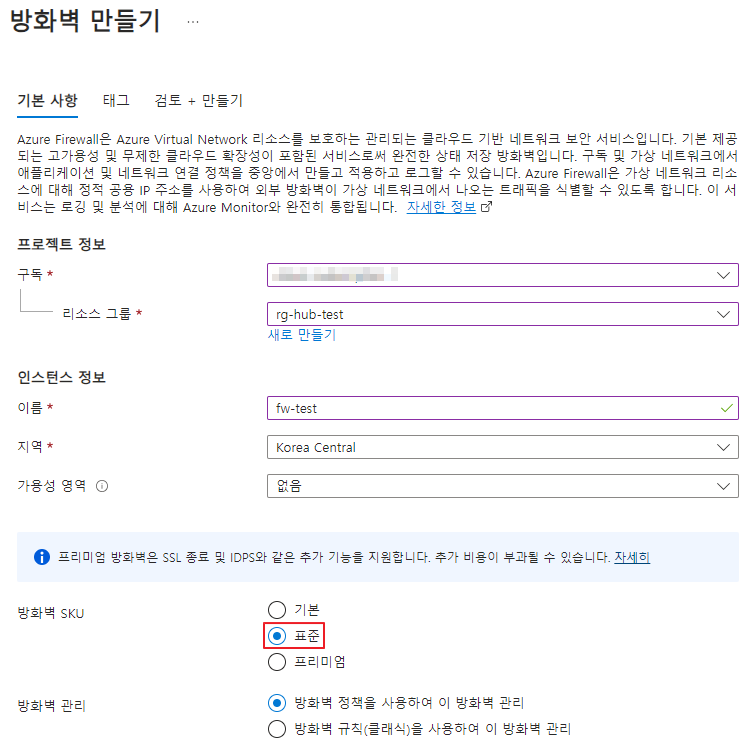 리소스 그룹 : rg-hub-test # Hub 대역 리소스 그룹 선택