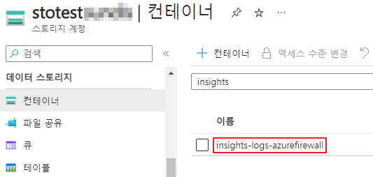 - [스토리지 계정] > [데이터 스토리지] > [컨테이너] > [insights-logs-azurefirewall] 컨테이너 클릭