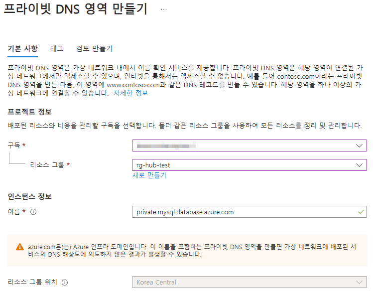 - [검토 + 만들기] 탭에서 [만들기]를 클릭하여 Hub 대역에 [Private DNS Zone]을 생성합니다.