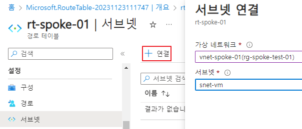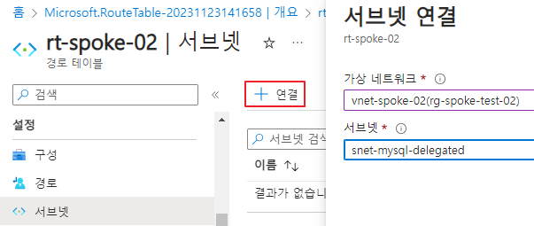 - rt-spoke-02 > [설정] > [서브넷] > [+ 연결]