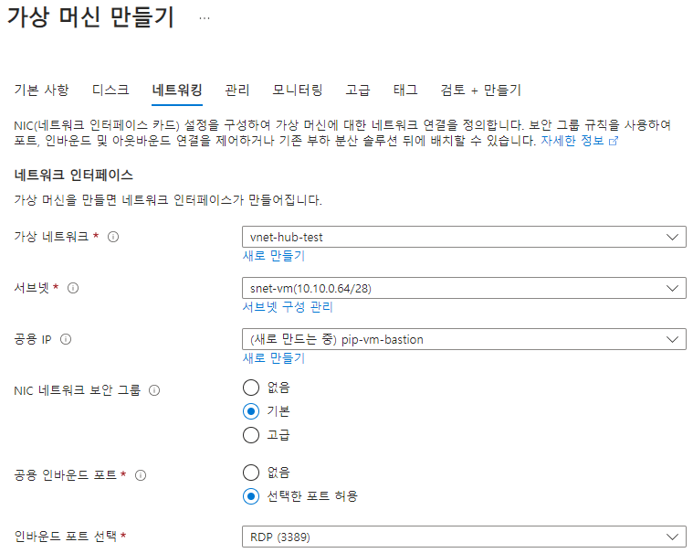 가상 네트워크 : vnet-hub-test # Hub 대역의 가상 네트워크 선택