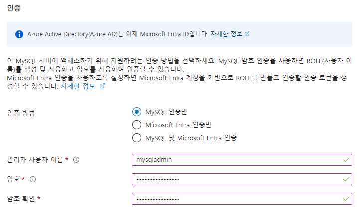 - 관리자 사용자 이름 : sqladmin # 원하는 사용자 이름 입력