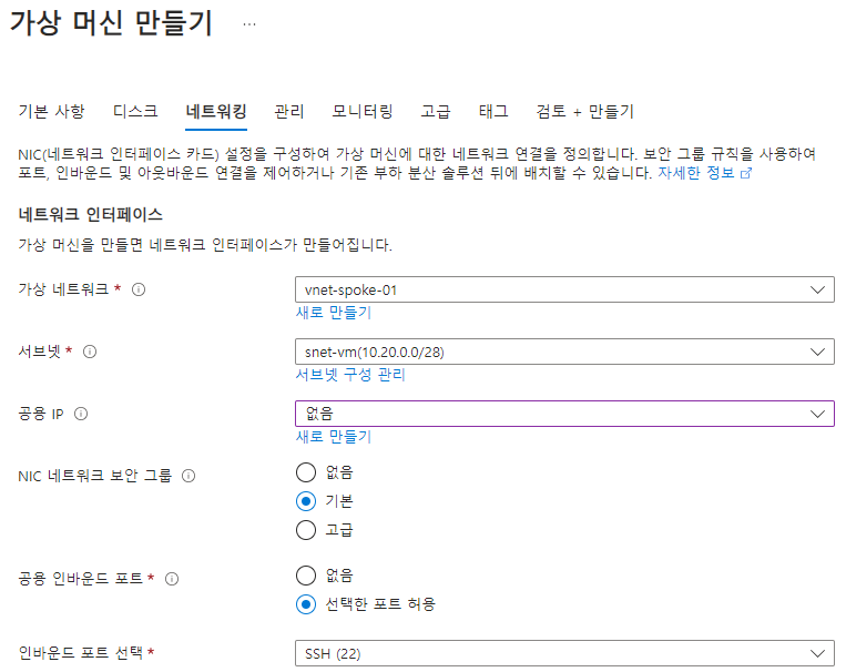 공용 IP : 없음 # Hub 대역에 배포한 [가상 머신]을 통해 접속할 것이므로 공용 IP 불필요