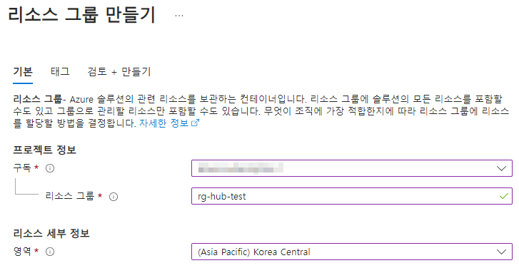 리소스 그룹 : rg-hub-test # 원하는 리소스 그룹 이름 입력