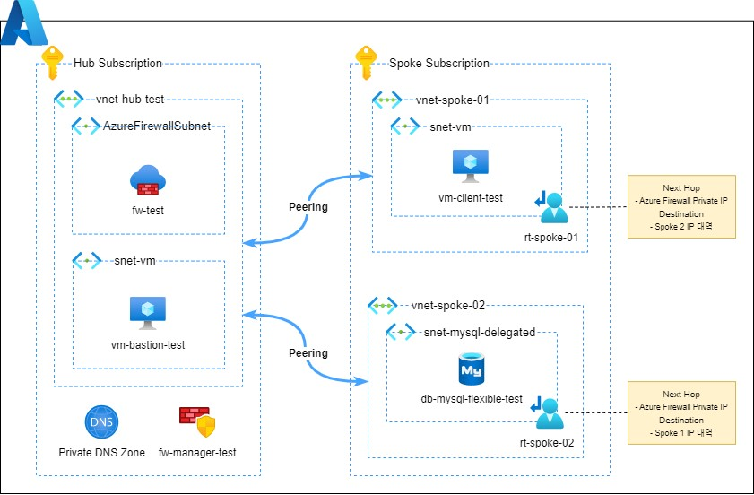 Spoke 1 대역의 VM에서 Azure Firewall을 거쳐 Spoke 2 대역의 MySQL Flexible Server에 접근할 수 있도록 Azure 환경을 구성하는 것이 이번 주제의 목표입니다.