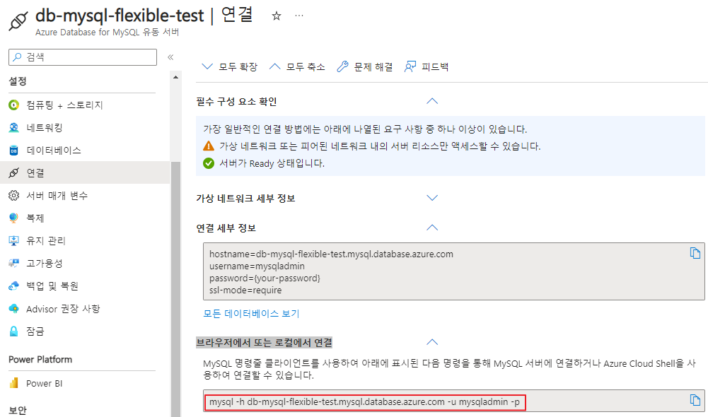 - [Azure Database for MySQL Flexible Server] > [설정] > [연결] > [브라우저에서 또는 로컬에서 연결] 클릭 후 명령어를 복사합니다.