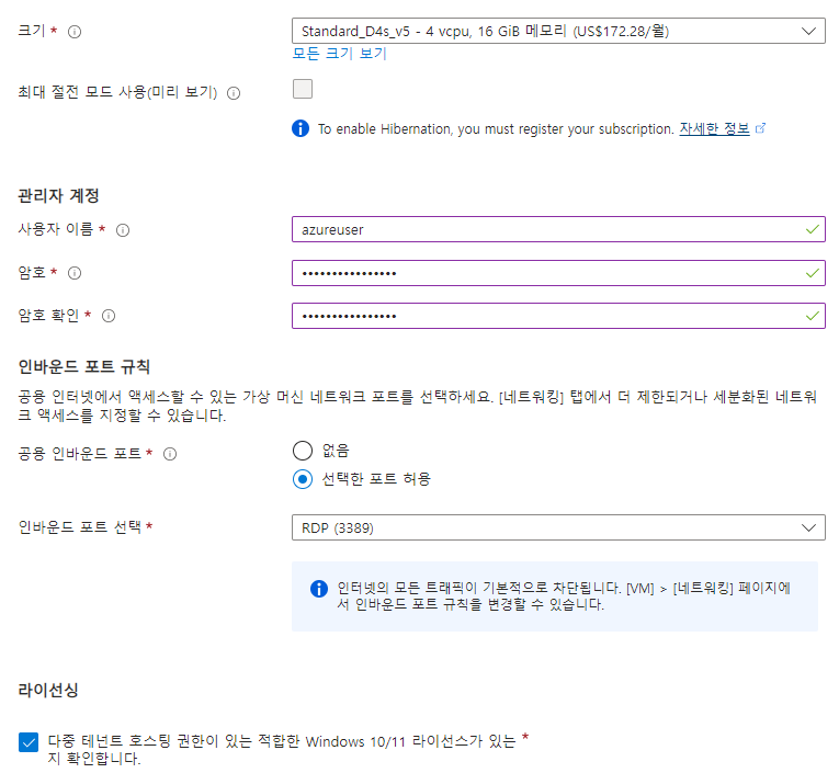 - 사용자 이름 : azureuser # 원하는 이름 사용